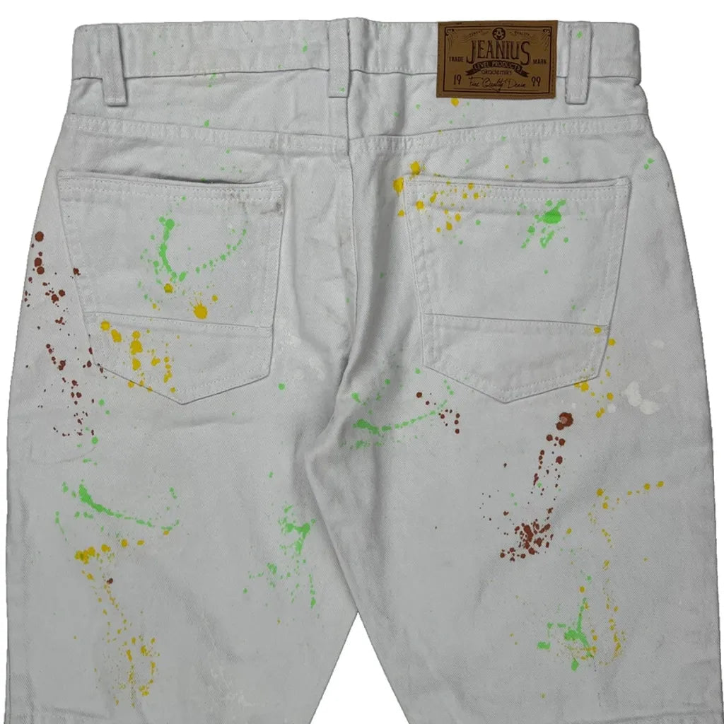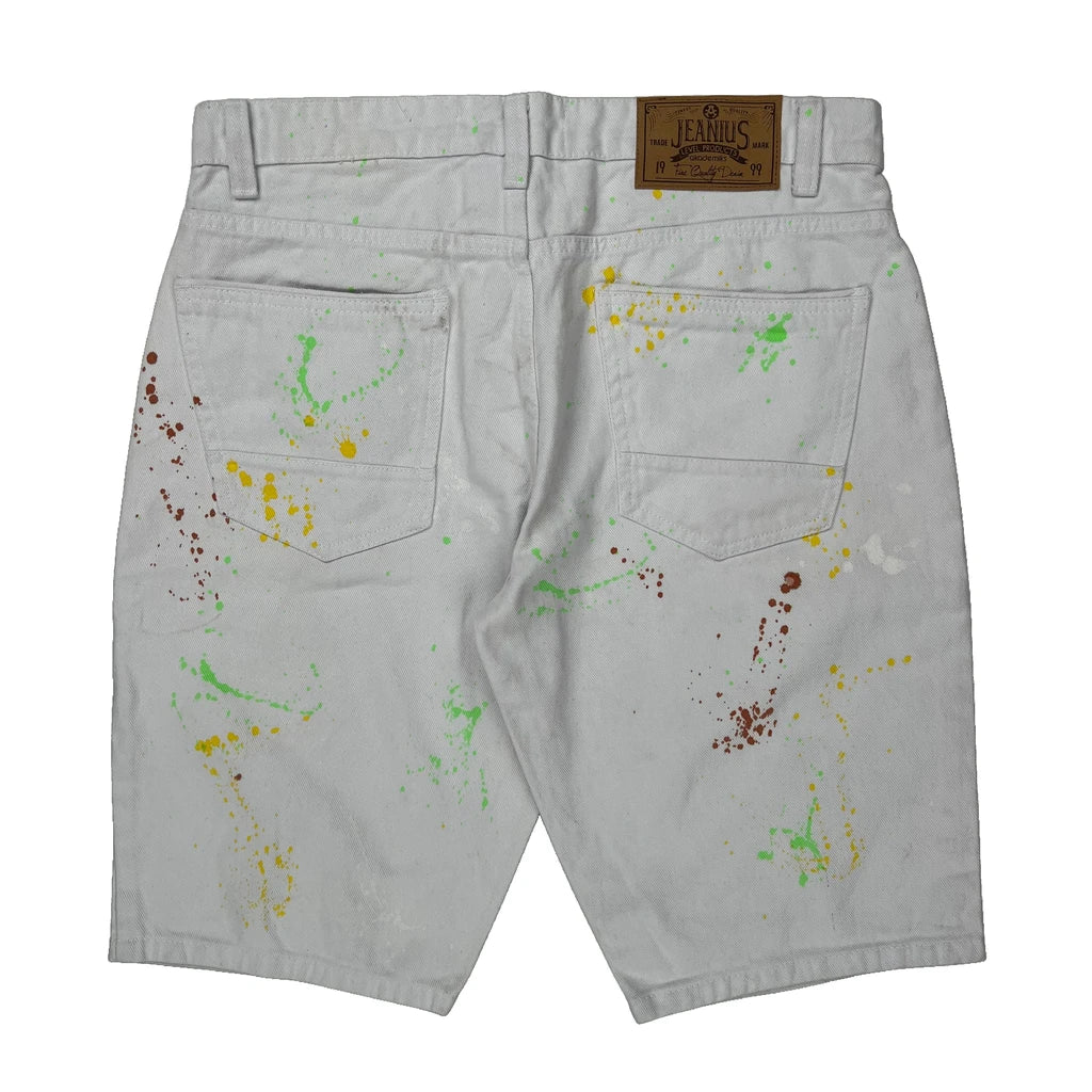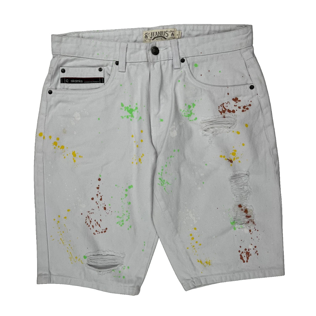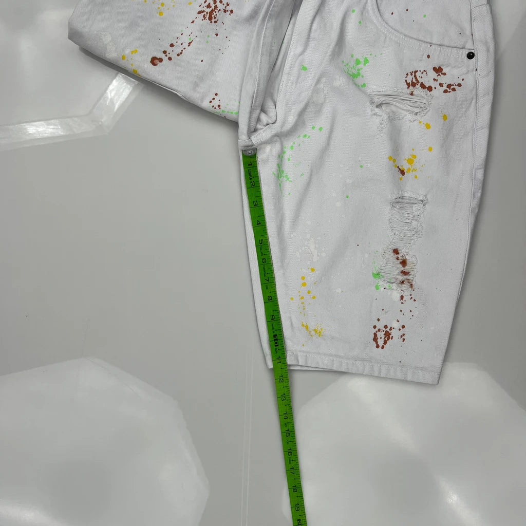 White Denim Shorts With Multicolored Paint Splatters And Ripped Details.