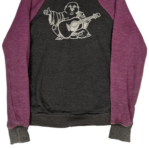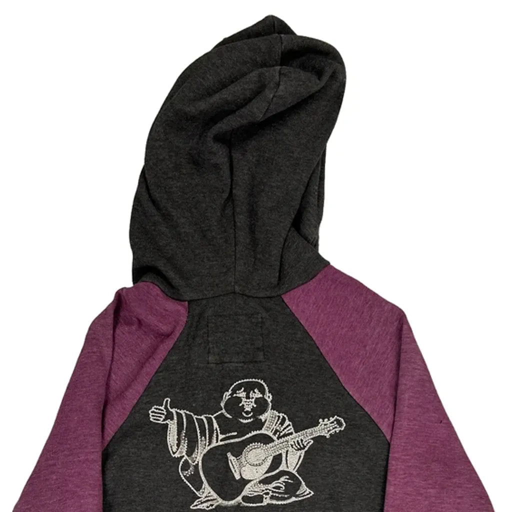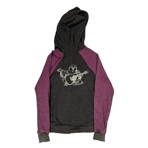 Grey And Purple Hoodie With Musician Graphic On Back, Faded Elbows