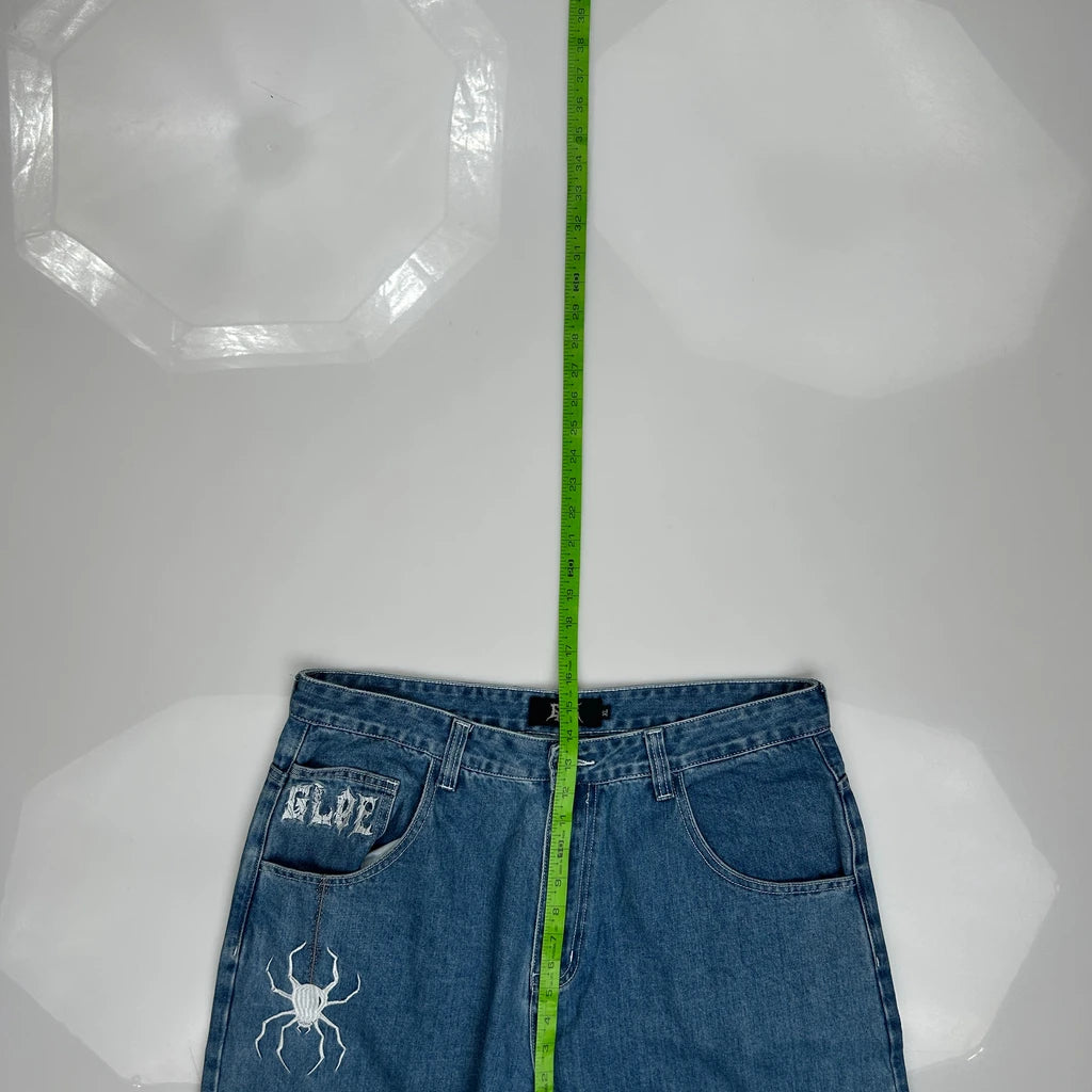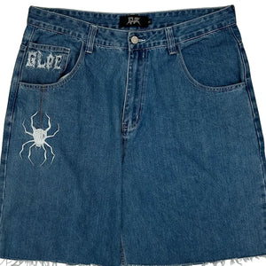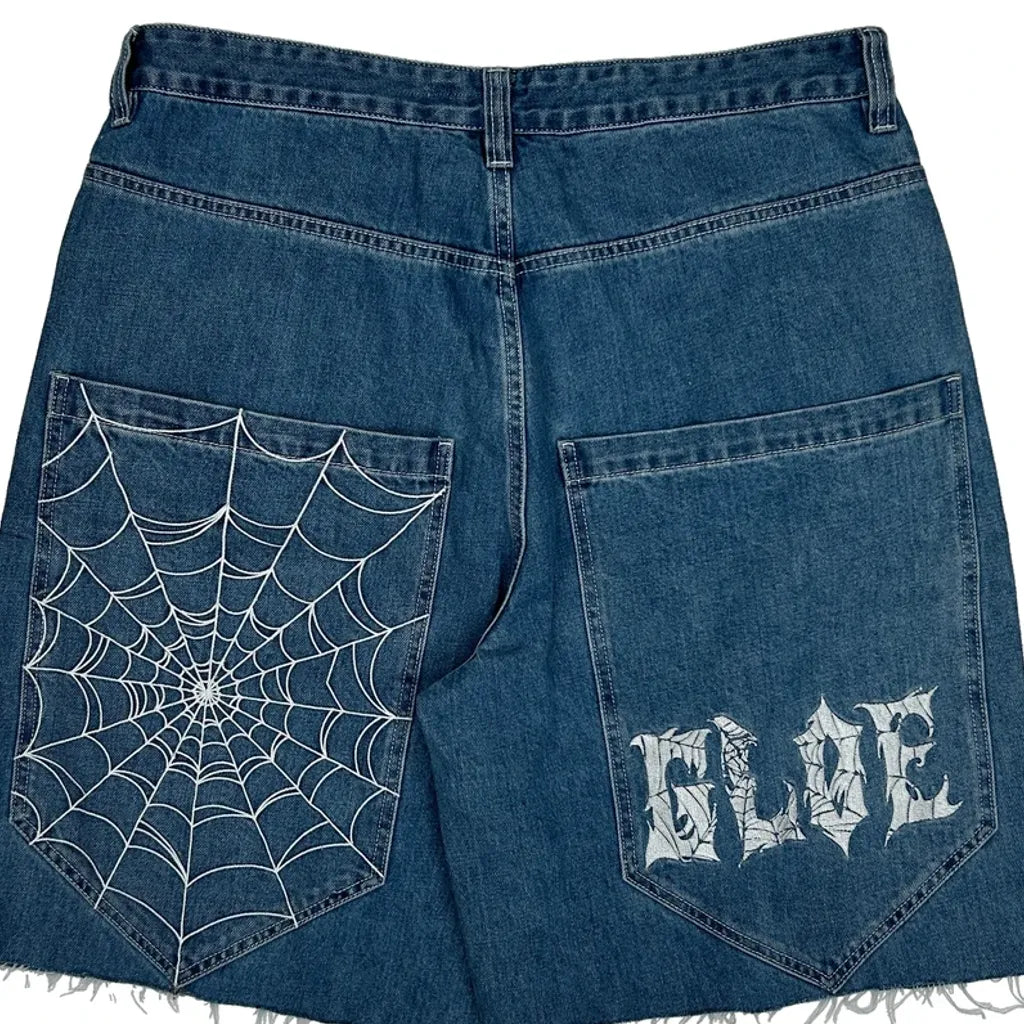 Spider Web Gloe Baggy Graphic Denim Shorts - 36W 11L Blue Denim